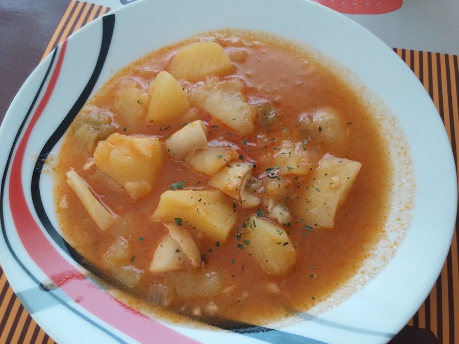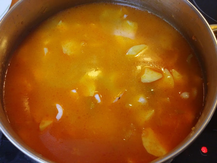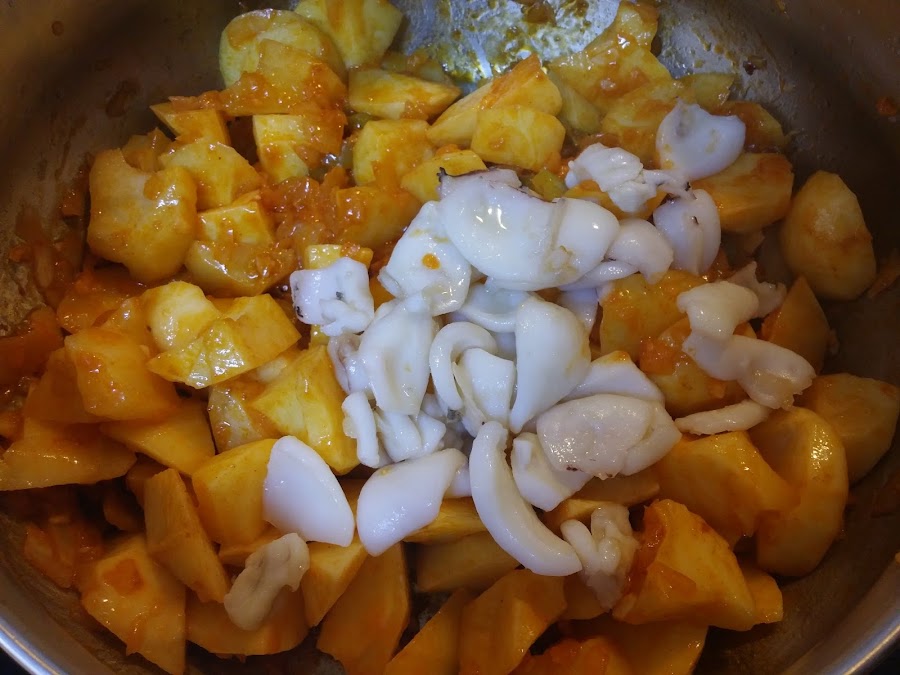Y cubrimos el guiso con el caldo de pescado. Salamos al gusto.