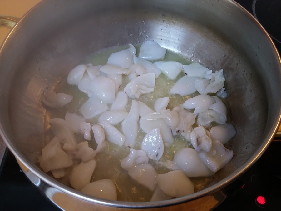 Lo primero que haremos será limpiar la sepia y cortarla en trozos. La vamos a saltear en una cacerola amplia con un chorreón de aceite.