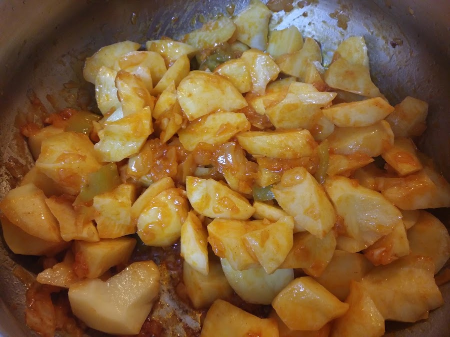 Ahora vamos a pelar las patatas, a trocearlas y las añadimos al sofrito.