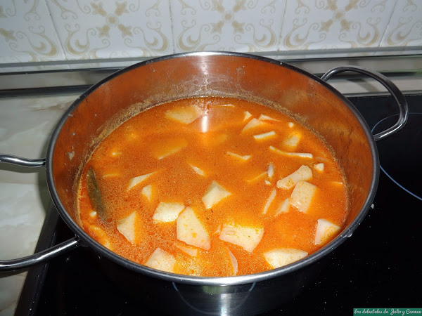 Mantendremos las patatas en el guiso unos 20 minutos (hasta que las patatas queden tiernas). Según lo vayamos viendo, verteremos mas caldo en caso necesario (nosotros tuvimos que echar 2 vasos mas). A mitad de cocción, volveremos a probar la salsa por si hiciera falta rectificar de sal.