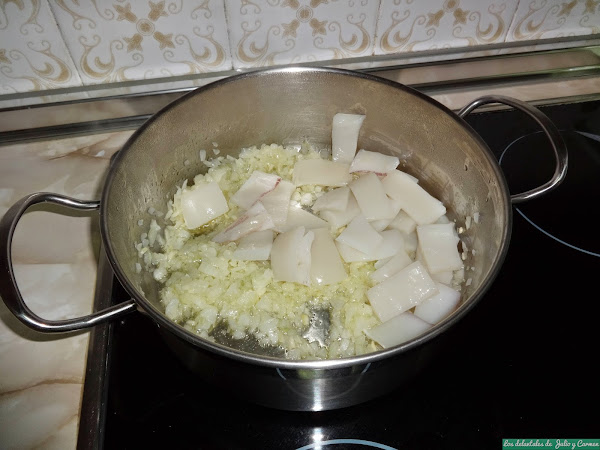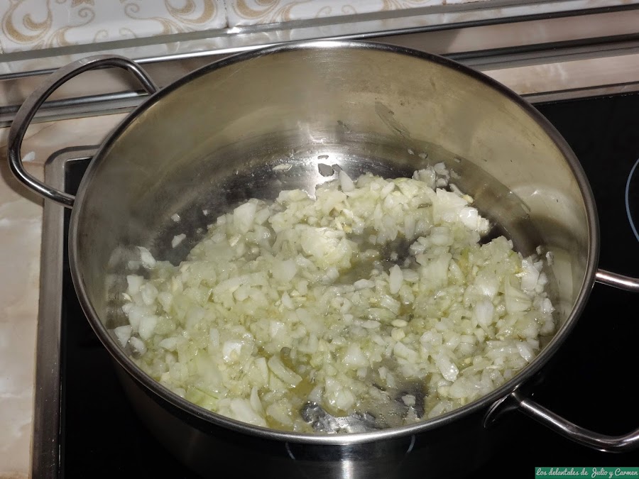 En una cazuela, pocharemos lentamente y a fuego medio-bajo, la cebolla y el ajo.