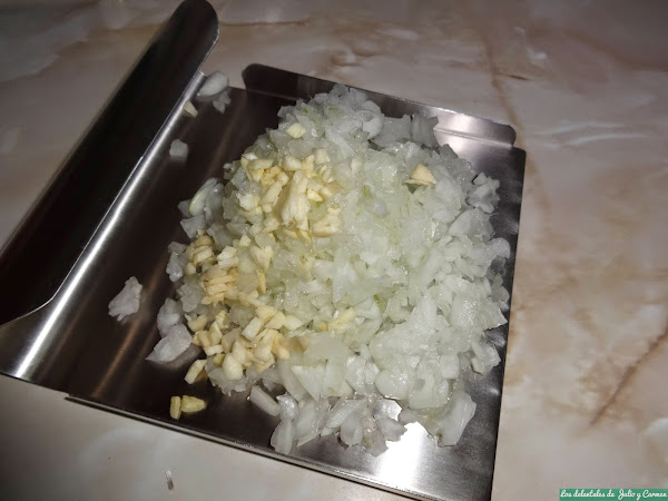 Pelamos y picamos finamente la cebolla y dos de los tres dientes de ajo. La sepia la cortamos en trozos de mas o menos el mismo tamaño. Reservamos.