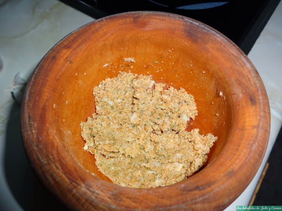 Antes de ponernos con el guiso, dejaremos preparado el majado que usaremos mas tarde. Para lo cual, machacaremos en el mortero el diente de ajo sobrante, las almendras, el pan tostado y un poco de perejil.