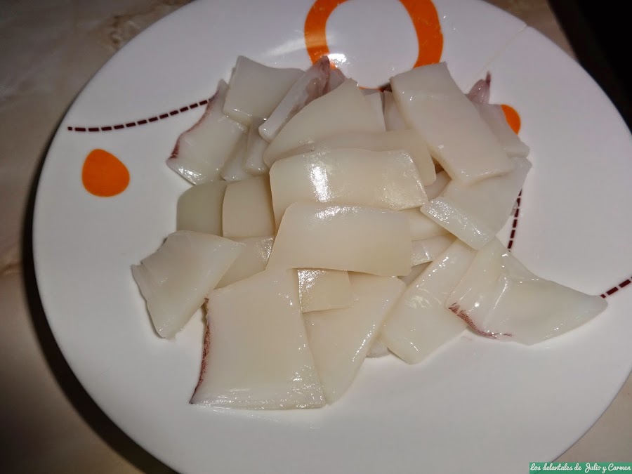 Como os contaba, el ingrediente del que nosotros disponíamos en el congelador era tubo de pota, que es mas barato que los calamares o la sepia, y que no difiere en exceso con estos. Por esto, pese a que la receta que teníamos en mente era con sepia o calamar, finalmente la realizamos con pota, aunque preferimos mantener el nombre a la receta, ya que es mas conocido y a todo el mundo le suena mas el nombre de la sepia.