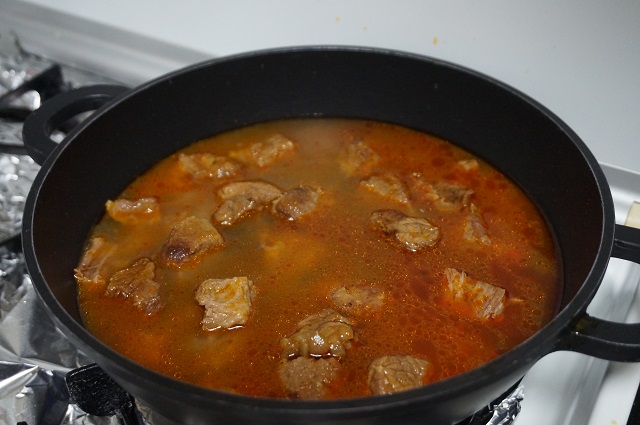 Podemos seguir con el guiso en la misma olla o en otra cazuela ponemos la carne con la salsa y cubrimos con un buen vaso de agua.