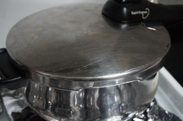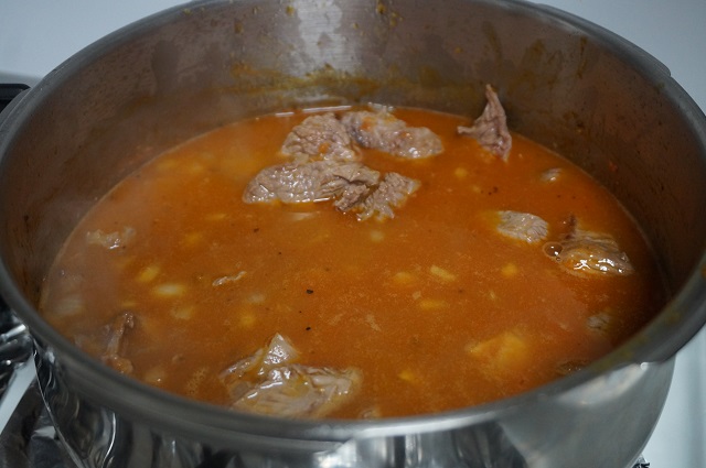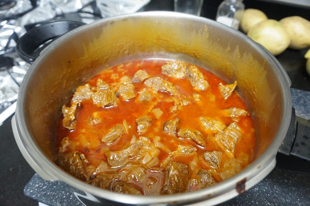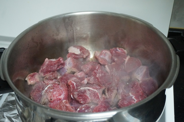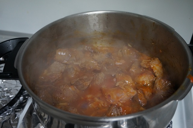 Ahora le ponemos un vaso de agua que cubra la carne y cerramos la olla, lo dejamos cocer 15 minutos.