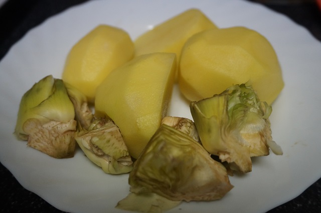 Mientras se hace la carne vamos cortando las patatas y limpiando las alcachofas.