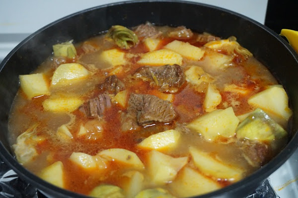 Un rico guiso de ternera con patatas y alcachofas. Riquísimo!!!!