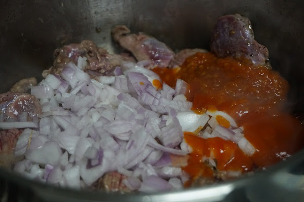 Una vez dorada le pondremos la cebolla cortada a trozos y el tomate triturado.