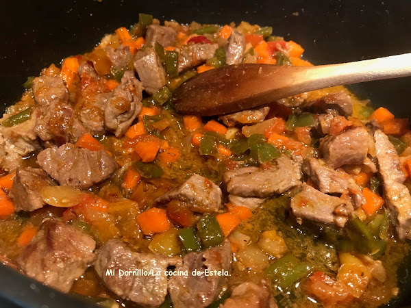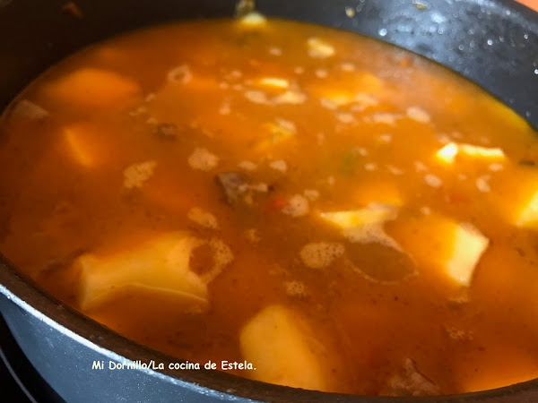 Dejamos cocer a fuego medio/bajo, hasta que las patatas y la carne estén tiernas.