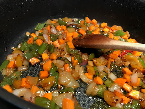 Después en el mismo aceite haremos el refrito, los pimientos,los ajos y la cebolla todo picadito, refreímos. Poner la zanahoria picada.