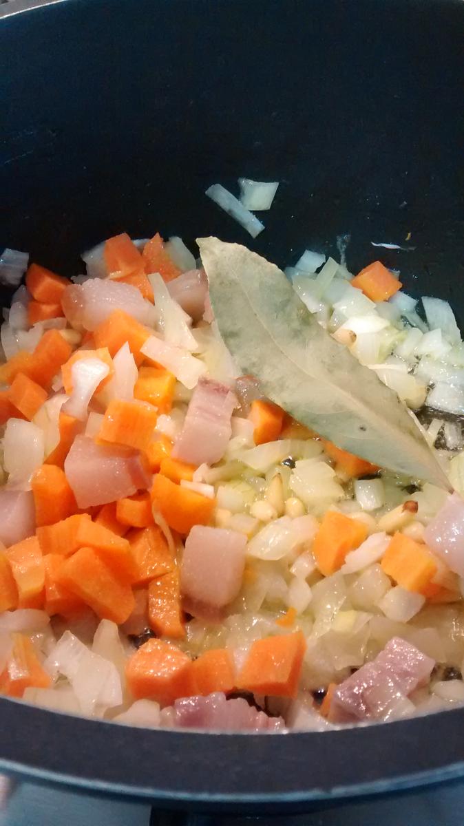 Añade aceite en un cazuela y cuando empiece a estar calentito incorpora la cebolla bien picadita y dale unas vueltas; a continuación añade la zanahoria, los piñones, trocitos de tocino ibérico y una hoja de laurel. Deja cocer 5 minutos el conjunto y añade el tomate bien triturado, un poquito de sal y deja que se sofría un poquito, a continuación añade las patatas y da unas vueltas. Por último añade las albóndigas.