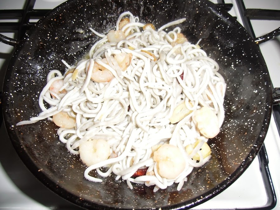 A continuación agregamos las angulas sucedáneas, mezclamos todo muy bien y salpimentamos.