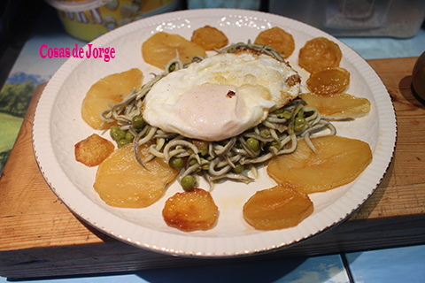 Hoy os presento un apetitoso plato, muy fácil de realizar, uniendo simplemente un paquete de angulas sucedáneas congeladas con unos guisantes de lata.