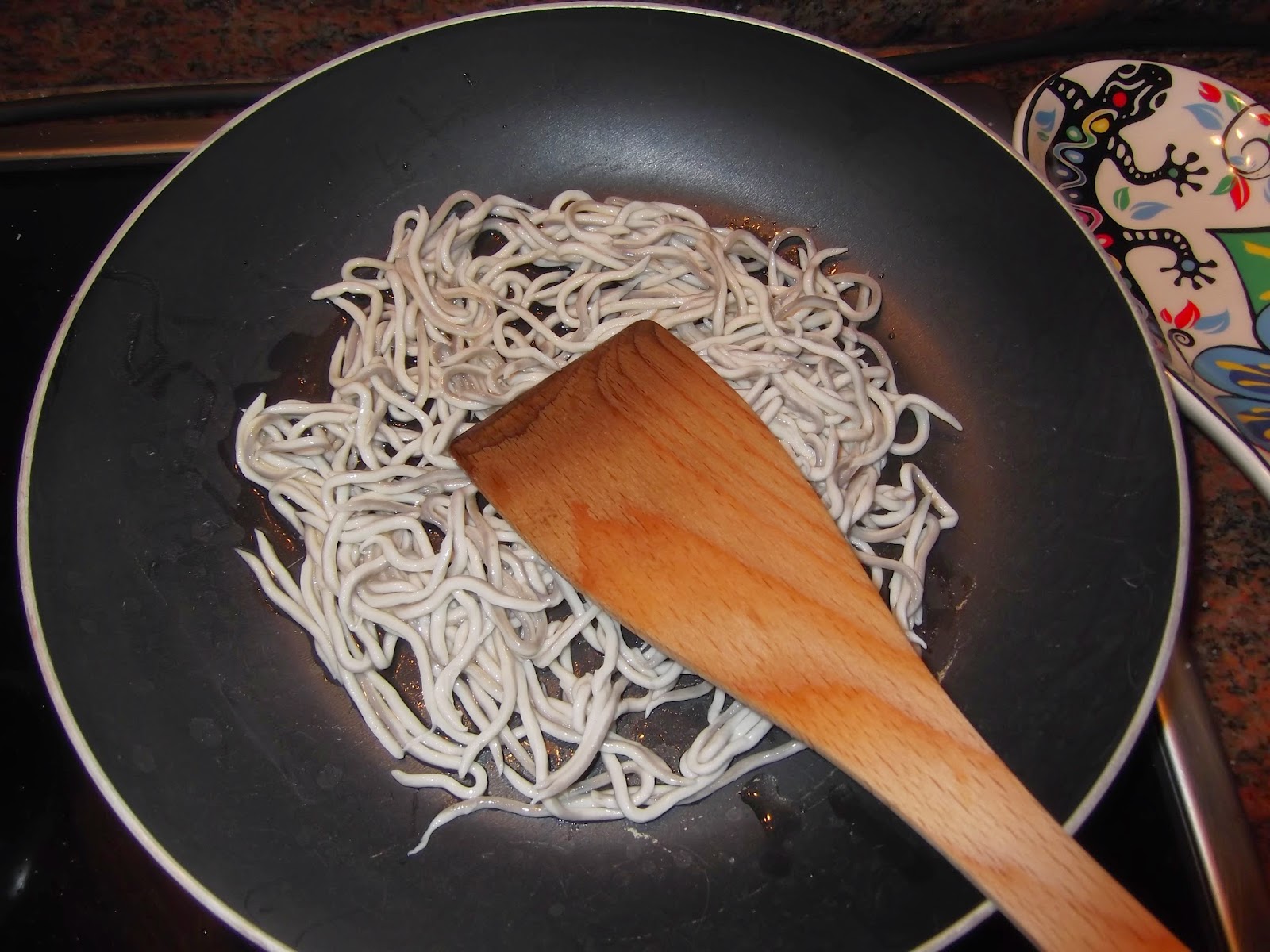 En la misma sartén echáis un buen chorro de aceite con los otros dos dientes de ajo y cuando estén dorados añadimos las angulas sucedáneas. Cuando estén casi cocinadas añadimos las setas y le damos varias vueltas para que se mezclen los sabores. Este plato ya está listo para comer, le podéis añadir un poco de perejil por encima o presentarlo en forma de tosta. Para ello, cortáis un par de rebanadas de pan, le untáis mayonesa o ali oli y ponéis encima el revuelto, ya veréis que bocado más exquisito.