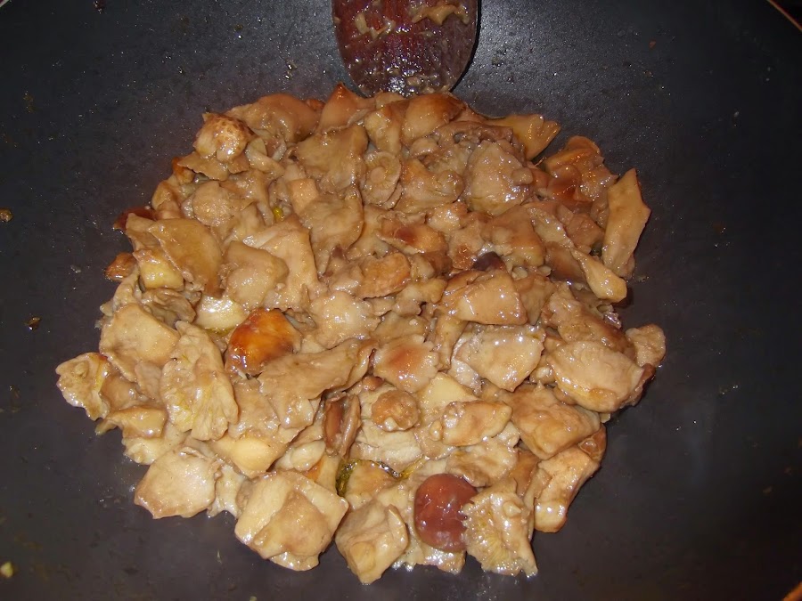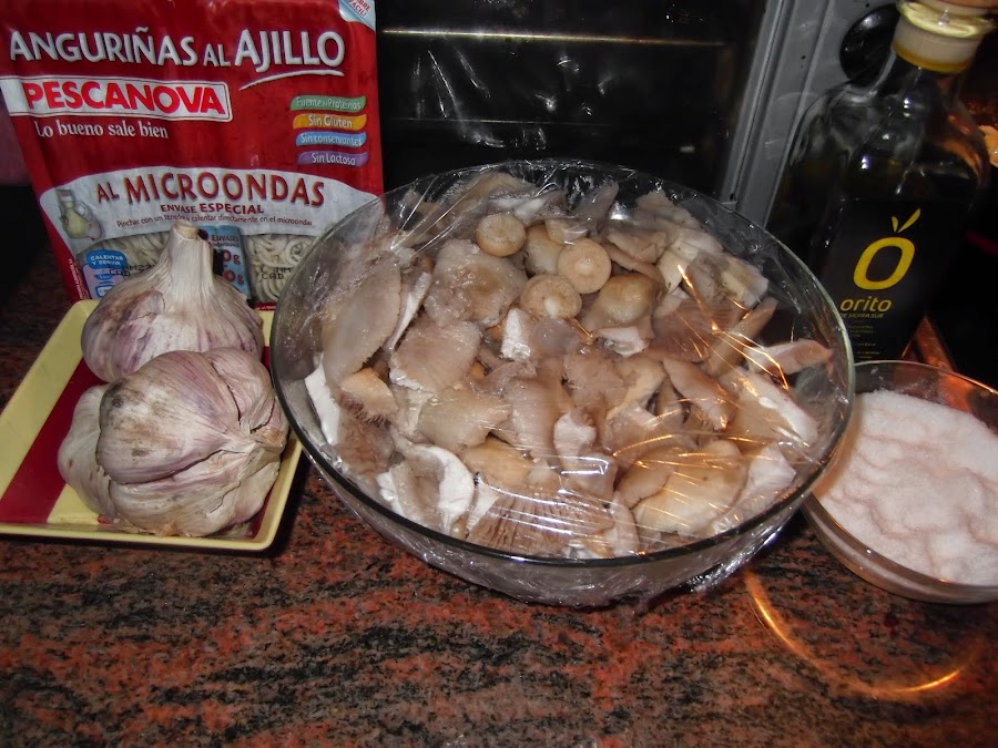 Lo primero que hacemos pelar los cuatro dientes de ajo. Cortamos en trozos pequeños dos dientes de ajo, los echamos en la sartén con un chorro generoso de aceite y cuando estén dorados añadimos las setas y rehogamos, cuando casi se les haya consumido el agua salamos. Daros cuenta que las setas de chopo suelen contener bastante agua por lo que las tenéis que dejar un buen rato hasta que se les haya quitado todo el agua y luego se refrían. Una vez que tenéis listas vuestras setas, las reserváis en un plato.