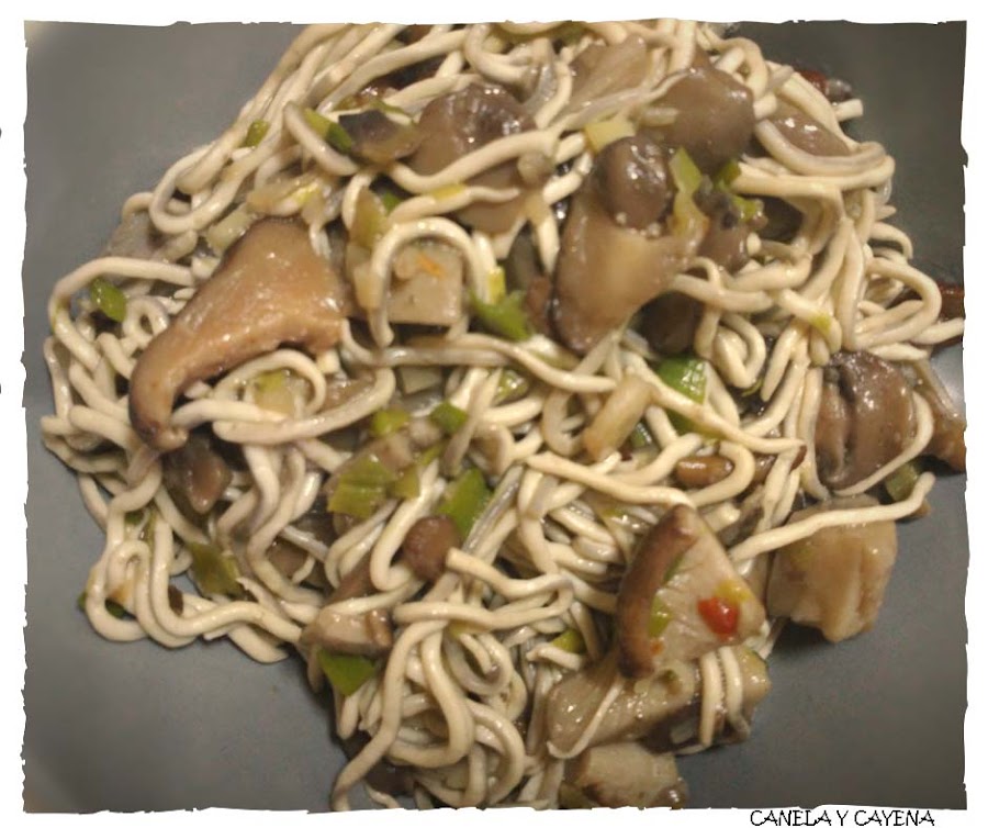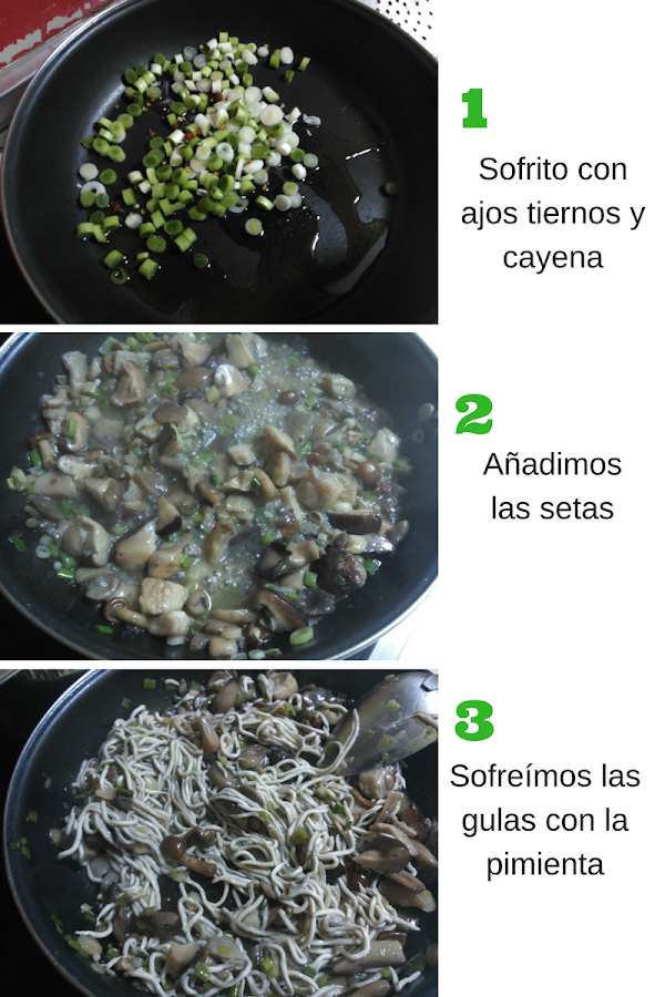 Hoy te traigo una receta facilísima y deliciosa para los amantes de la comida picantita: angulas sucedáneas con ajos tiernos y setas. Perfecta para comer pescado sin preocuparte de las espinas. Además de resultar muy ligera ya que las setas y los ajetes apenas aportan calorías, y que cocinando con cayena se consigue una mayor sensación de saciedad.
