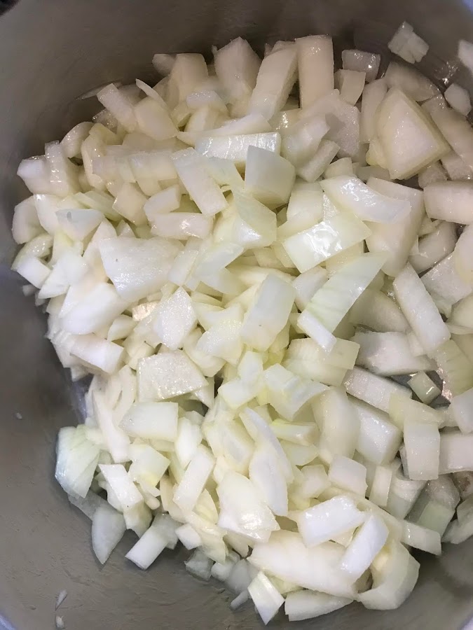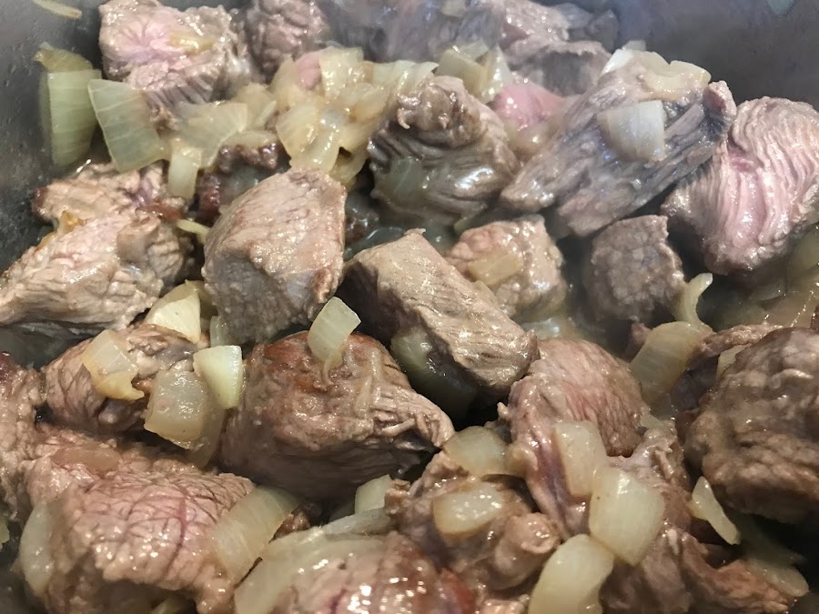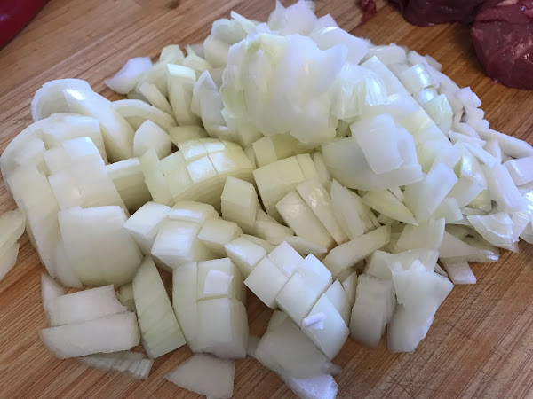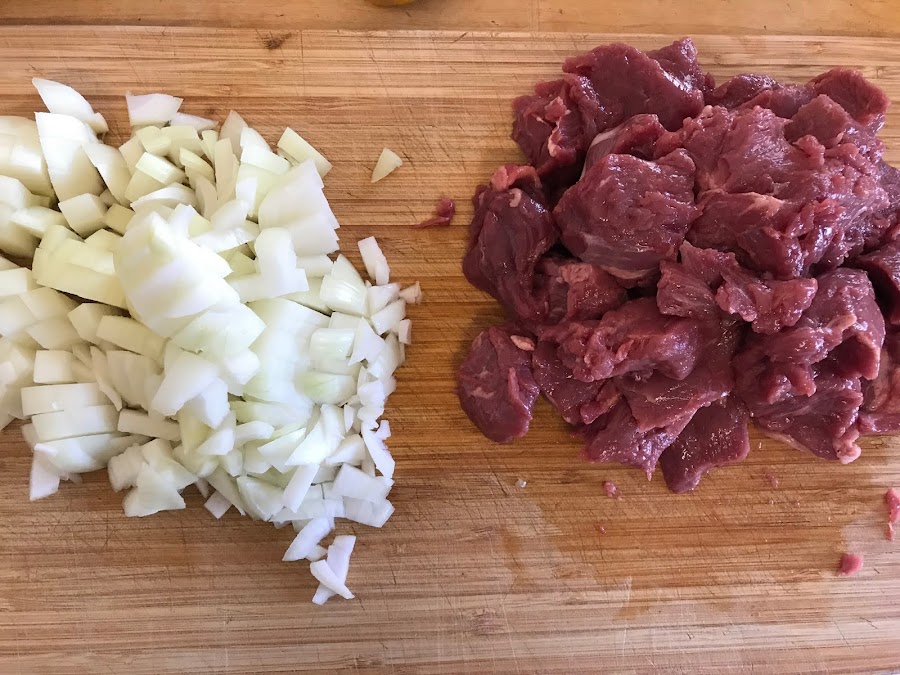 Con la carne cortada en dados como de 3 cm por lado, y las cebollas picadas en brunoise grande, ponemos el recipiente al fuego, con el aceite necesario, o sea cubriendo el fondo.