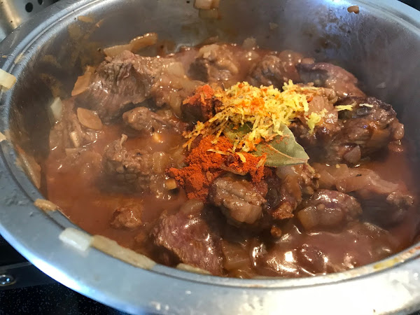 Desglasaremos con el vino si se quiere (yo no le voy a poner hoy) y tras unos minutos de evaporación, añadiremos las especias y la ralladura. En mis especias, he sustituido el pimentón picante por 1/4 de cucharadita de pimienta de cayena.