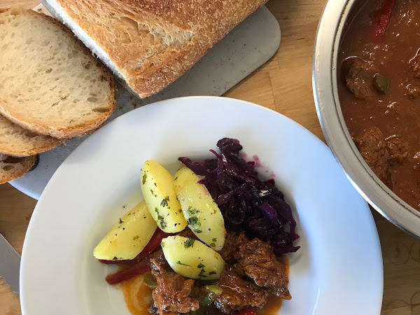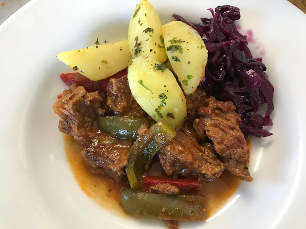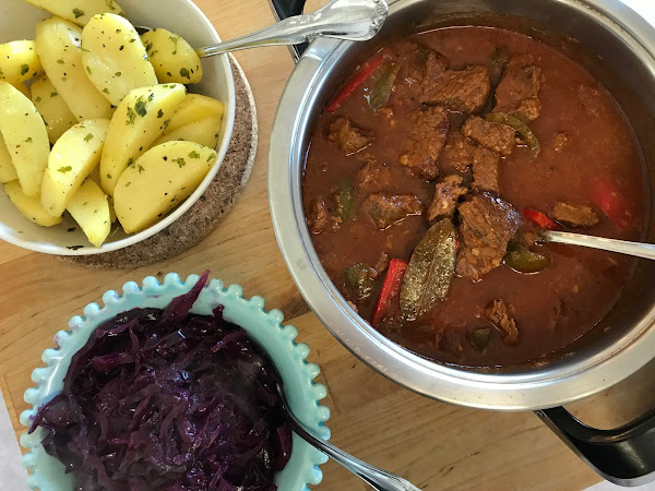 En mi mesa hoy: Gulasch al estilo tradicional, Rotkraut y patatas rehogadas con mantequilla.
