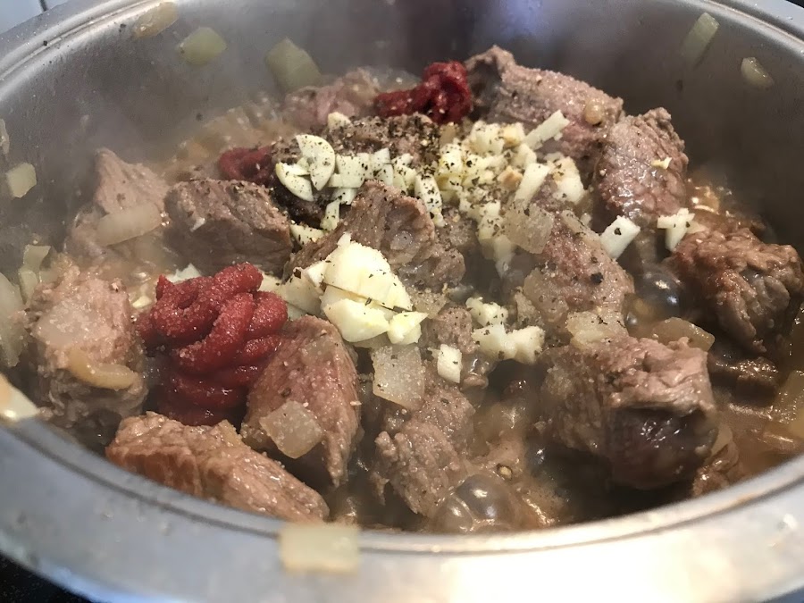 Comenzamos rehogando la cebolla unos 5 minutos, con sal. Seguidamente agregamos los trozos de carne junto con la manteca y rehogamos hasta que evapore todo su jugo. Salpimentaremos, añadiendo el ajo y el puré de tomate concentrado, y dejaremos cocinar por 3 minutos más.