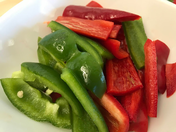 Se añadirán solamente tiras de pimiento rojo y verde (ya que el amarillo se reserva para otro guiso) y de forma opcional un chile rojo o guindilla. Todo esto se incorpora en los últimos momentos de la cocción.Las cebollas.