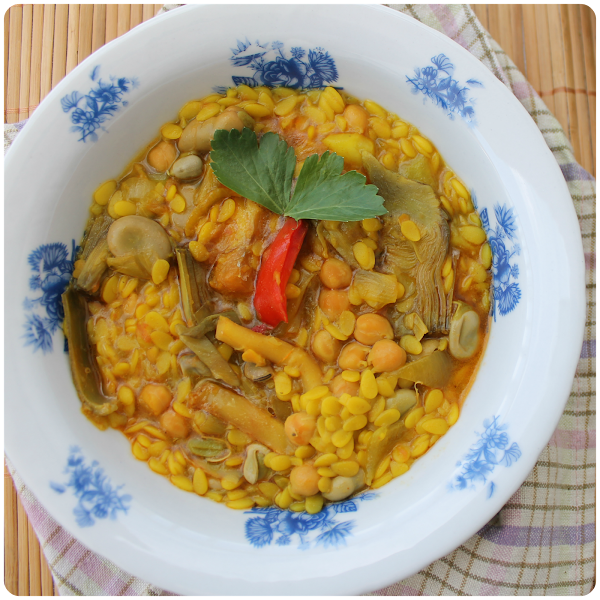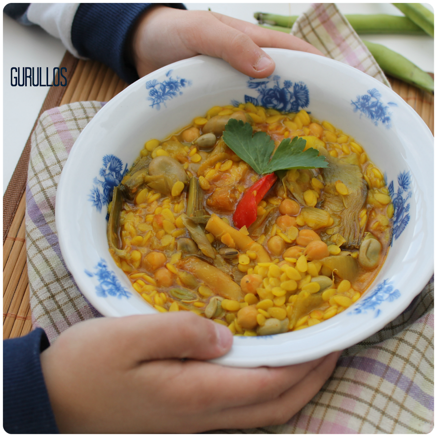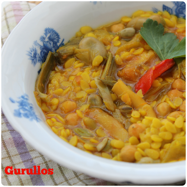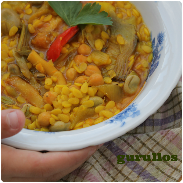 En una olla con aceite freímos la sepia que ya habíamos limpiado y troceado, cuando está dorada la apartamos. En ese mismo aceite freímos el puerro, cebolla,pimiento rojo ,ajos y sal, todo cortado en trocitos. Añadimos el tomate rallado. A continuación una cucharada de pimentón y la sepia. Cubrimos de agua dejando que hierva. Mientras limpiamos las alcachofas, patatas y las habas. Una vez limpios se lo agregamos al caldo. Añadímos azafrán y un poquito de sal si fuera necesario. Al ratito añadímos los garbanzos cocidos y los gurullos. Tapamos la olla dejando cocer unos 15 minutos o hasta que esté las patatas blandas. Una ricura, si no probar y me contáis!