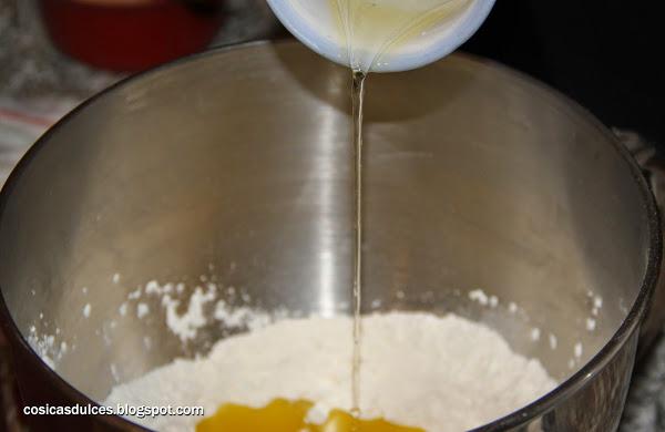 En un bol mezclamos bien la harina, la sal, la levadura, el azúcar y el azúcar avainillado. Hacemos un hueco en el centro y vertemos el agua, el anís y el huevo batido.