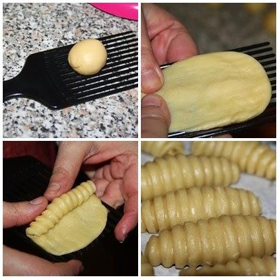 Ahora viene lo chulo. Ponemos la bolita encima de un peine (sin usar, se entiende). Aplanamos la masa y la estiramos sobre toda la superficie del peine. A continuación rodamos la masa muy suavemente (como si liásemos un cigarro) humedeciendo el extremo con un poquito de agua para que la masa quede bien sellada.