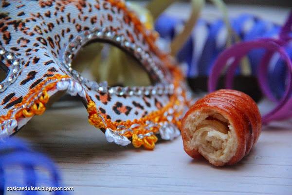 Y ya tenemos listo nuestros deliciosos gusanillos de Carnaval. Os aseguro que es una delicia. Mirad como se aprecia en el corte las capas del enrollado.