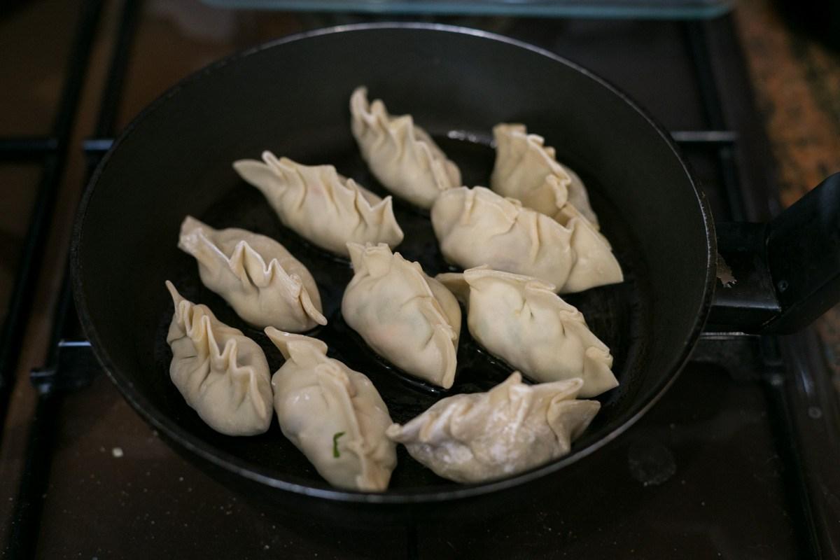 Al sartén: Calentar un sartén con 1 cucharada de aceite, cuando esté bien caliente, bajar el fuego, colocar las gyosas por una cara y esperar a que se doren (aprox 5 minutos). Retirar el sartén del fuego, esperar 1 minuto a que se enfríe y con mucho cuidado agregar 1/2 taza de agua. Tapar y dejar durante 5 minutos más a que se cocina en agua. Escurrir el agua, sacar con cuidado de que no se rompan y colocar sobre un plato. Opcionalmente agregar cebollín/ciboulette picado por encima para decorar.