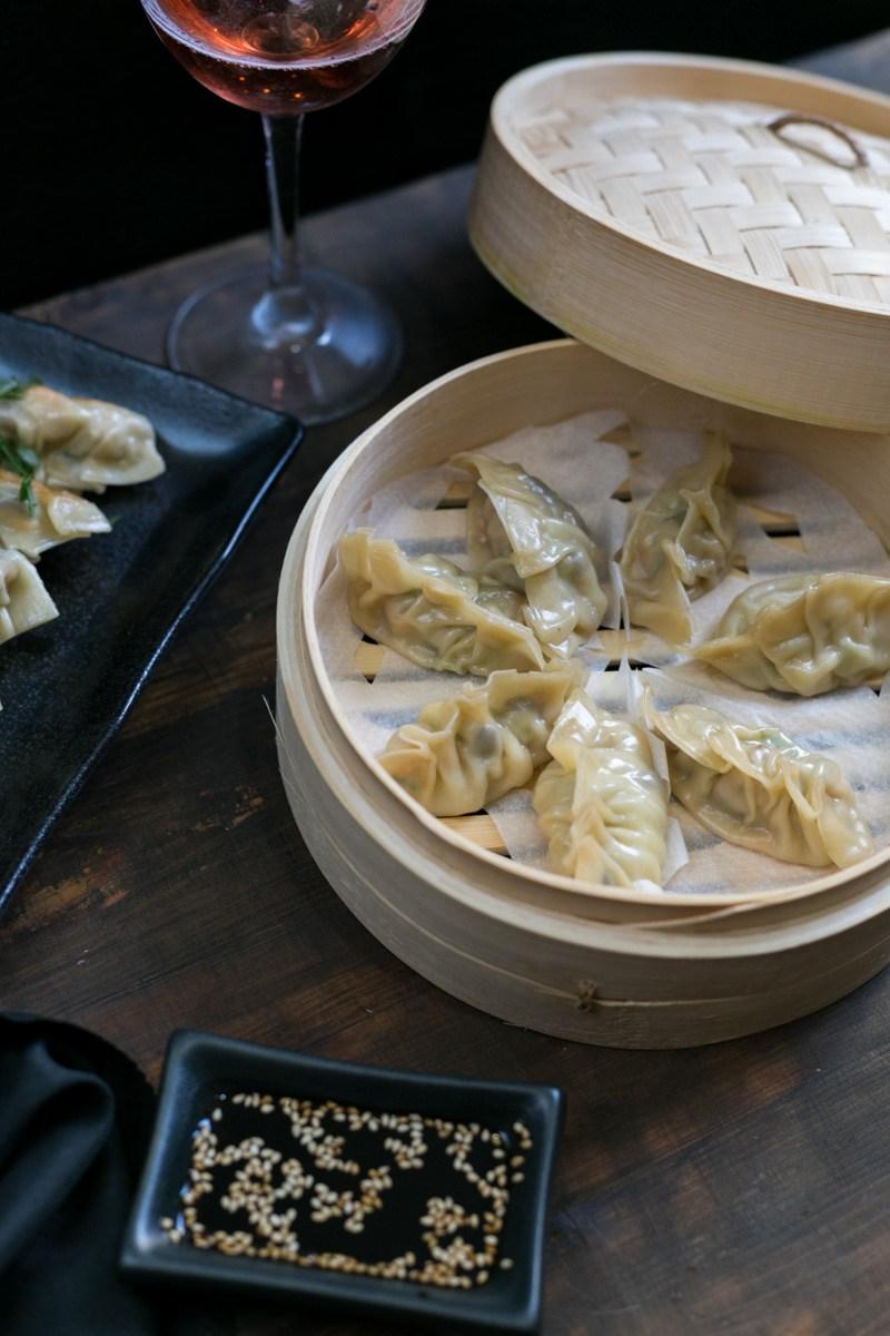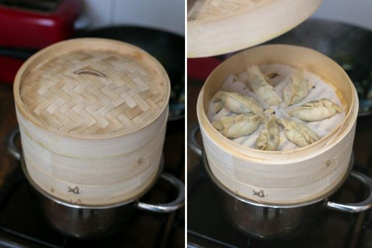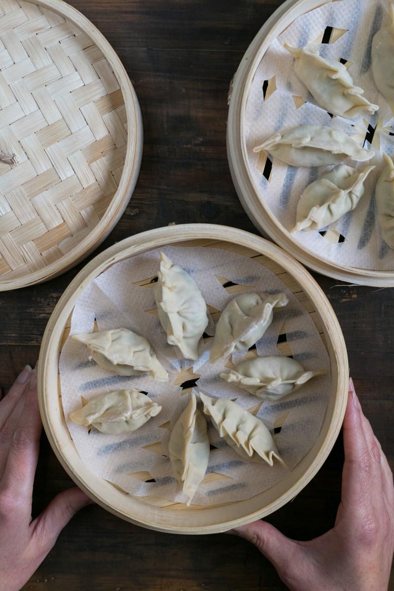 Al vapor(con vaporera): Cortar el papel mantequilla o de horno del tamaño de la base de la vaporera y hacer pequeños orificios para que el vapor pueda atravesarlo (este paso es opcional pero lo recomiendo mucho para que las gyosas no se peguen a la base de la vaporera y sea mucho más fácil sacarlas). Colocar el papel de horno en las bases de la vaporera y luego las gyosas, procurando que no se toquen entre sí (dependerá del tamaño de la vaporera la cantidad de gyosas que puedas colocar). Calentar aprox 1 taza de agua en una olla (con diámetro similar al de la vaporera) y colocar la vaporera por arriba sin que toque el agua. Cocinar aproximadamente durante 15 minutos o hasta que las gyosas se hayan hinchado y se vean pseudo-transparentes. Servir en la misma vaporera sobre la mesa.