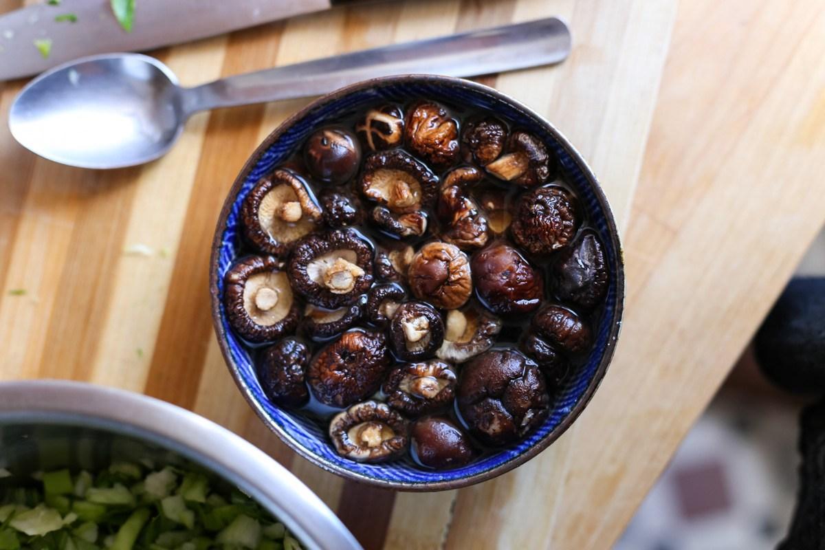 Hidratar en agua hirviendo las setas shiitake durante 10 minutos.