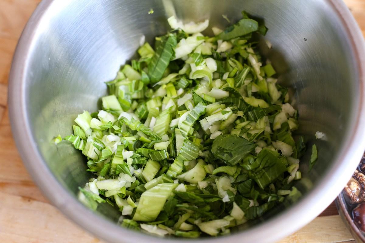 Picar finamente el pak choi, los cebollines y el ajo. Rallar las zanahorias y el jengibre. Saltear el ajo y los cebollines durante 2 a 3 minutos a fuego medio en un sartén con 1 cucharada de aceite y reservar.