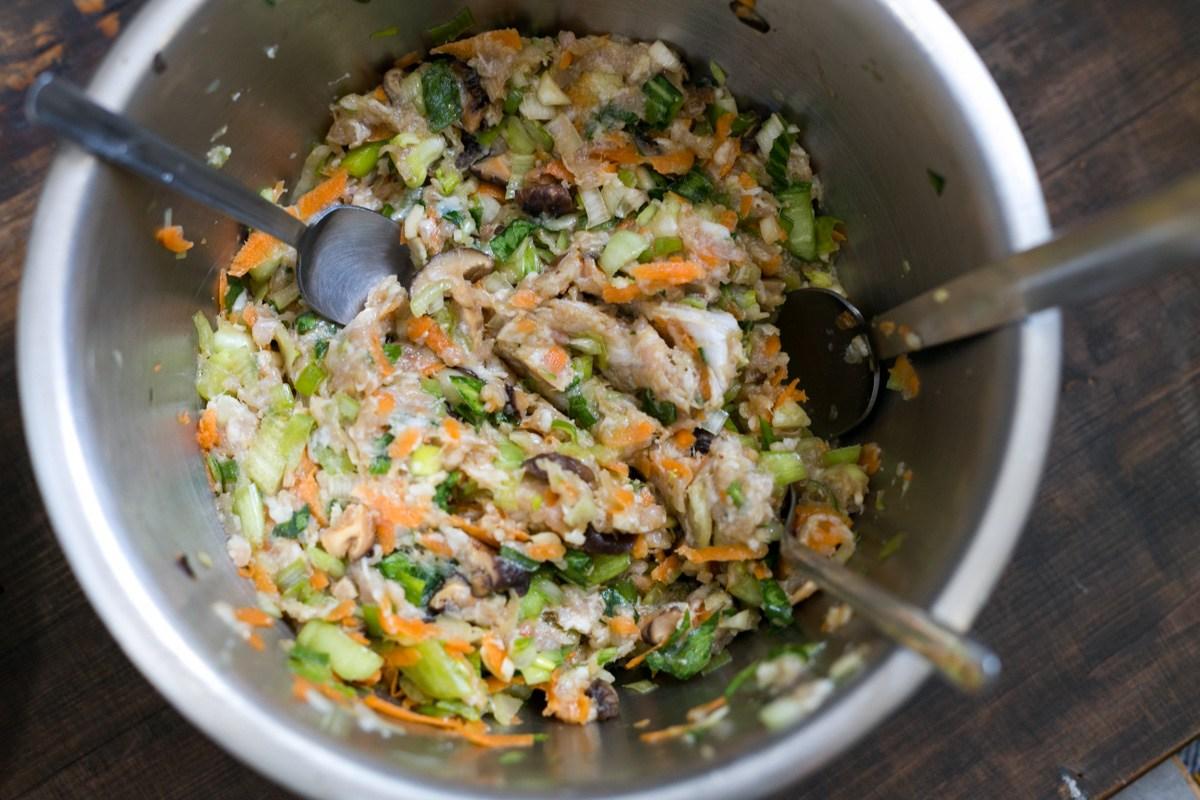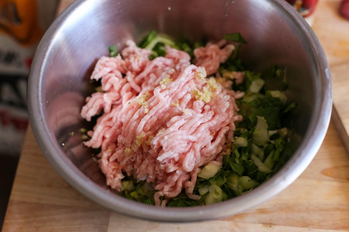 Por otro lado un bowl agregar la carne de cerdo picada, la mezcla de verduras y salteado (paso 2) y mezclar muy bien con la ayuda de las manos. Luego agregar la salsa (paso 3). Mezclar todo muy bien y dejar reposar 30 minutos en el refrigerador (nevera).
