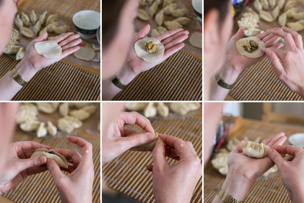 Para armar las gyosas: Colocar la masita redonda en la palma de la mano (si es necesario estirarla con cuidado para hacerla más fina y delgada), agregar aprox 1 cucharadita de mezcla al centro y con la yema de un dedo esparcir un poco de agua por los bordes. Doblar justo por la mitad y para cerrar hacer pequeños dobleces (pliegues) como se muestra en la foto. Intentar dejar la base de la empanadilla plana (será más fácil para cocinarlas). Repetir el proceso con todas las masitas.