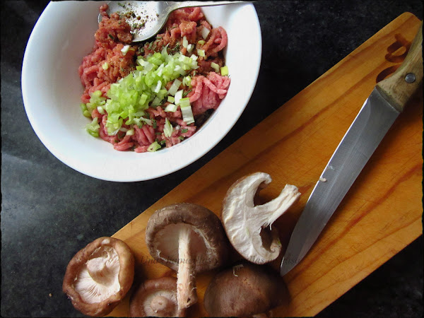 Lo primero es añadir los ingredientes a la carne picada. Poner la carne en un bol y agregarle el sake, la salsa de soja y el sésamo, remover bien. A continuación ponerle el ajo (yo preferí echarle ajo en polvo para que no tuviese un sabor tan fuerte, para gustos), el jengibre (si es fresco mejor, como yo no tenía, le eché una pizca en polvo), cebolleta seca en especia, nira o cebollino chino (yo usé el tallo verde de la cebolleta), 4 setas shiitake finamente picadas, pizca de sal y pimienta.