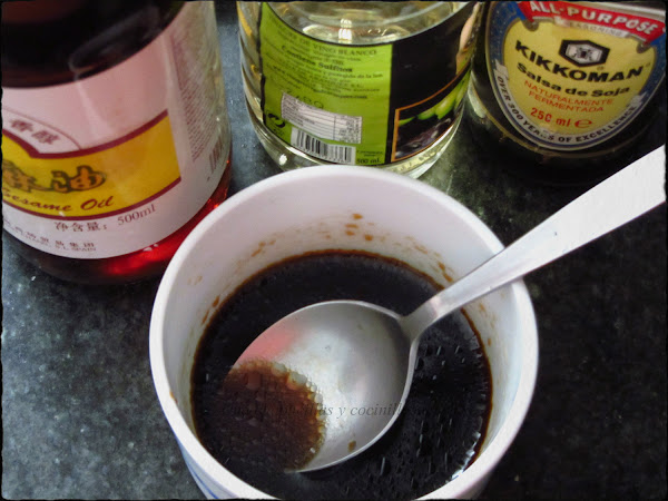 De mientras se cocinan, preparamos la salsa. Poner 3 cucharadas de salsa de soja, 1 cucharada de vinagre de arroz, una pizca de azúcar y unas gotas de aceite de sésamo picante.