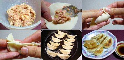 Mezclar los ingredientes en seco y luego añadir el agua caliente. Aplanar y cortar redondas para hacer las gyozas y listo.