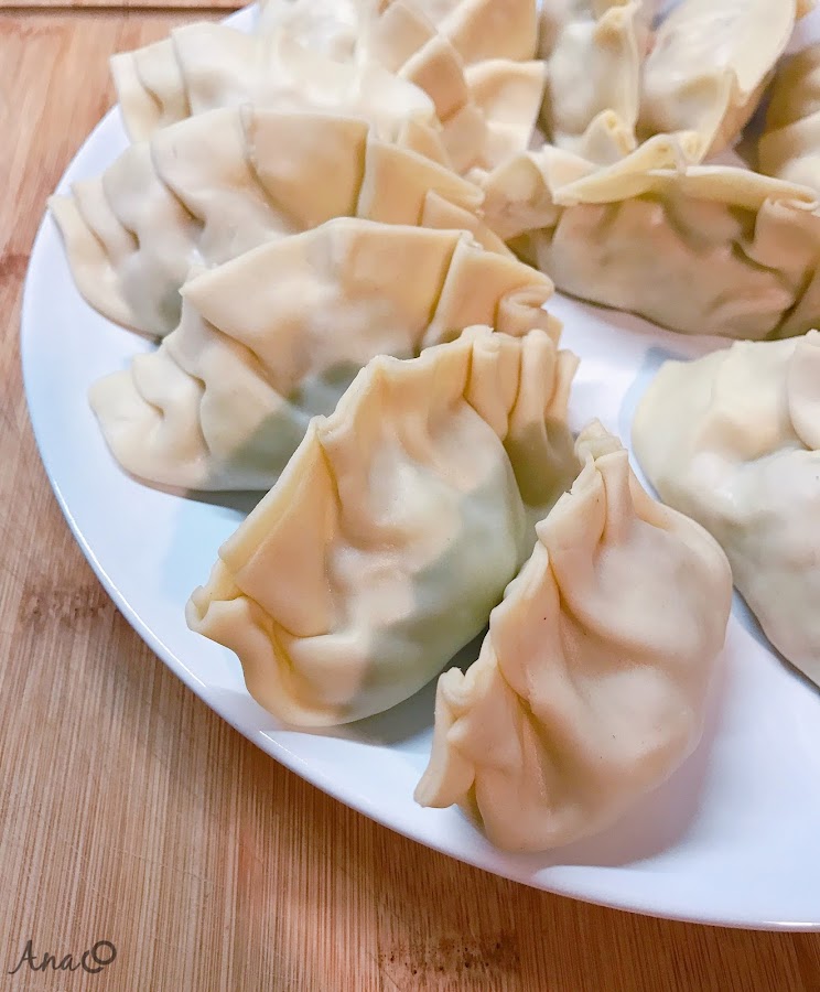4. Vamos haciendo todas las gyozas hasta terminar con la masa. Las que tenemos hechas las vamos poniendo en un plato tapadas con un trapo para que no se sequen. Una vez estén todas podeis elegir cocinarlas o congelarlas. Yo hice la mitad y la otra mitad la congele en un táper.