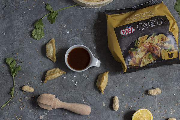 En el último año habéis conocido gran parte de los productos de la marca VIČI, y hoy os muestro sus deliciosas gyozas de pollo. Para los que no conozcáis las gyozas son las típicas empanadillas japonesas. La variedad en cuanto a sabores de la marca es amplia, de verduras, pescado o carne, incluso gyozas dulces. Se pueden preparar de varias formas: fritas, al horno, al vapor, en microondas.... Yo las he preparado de dos formas para que veáis cómo quedan: fritas y al vapor. Evidentemente la segunda opción resta calorías a la preparación, pero fritas quedan muy ricas también. He preparado tres salsas diferentes para poder disfrutar de este maravilloso plato. Lo mejor de estas gyozas es que nos solucionan un almuerzo o cena en diez minutos, cosa que se agradecen en estos tiempos que corren.