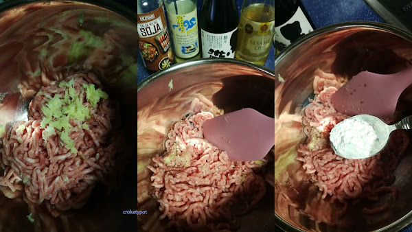Relleno: 250 g carne picada de cerdo, cebolla fresca, 1 diente Ajo,1 cucharadita jengibre fresco rallado, ralladura de 1 limón, cebollino fresco. Salsa de soja, Sake ó Vino blanco, Maizena, Aceite de Sésamo, vinagre de arroz (opcional)