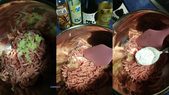 Hacemos el relleno, en un bol ponemos la carne de cerdo picada, le rallamos el ajo y el jengibre, mezclamos bien con la espátula; añadimos 1 cucharada de salsa de soja, otra de aceite de sésamo, otra de sake y otra de maicena, mezclamos bien.