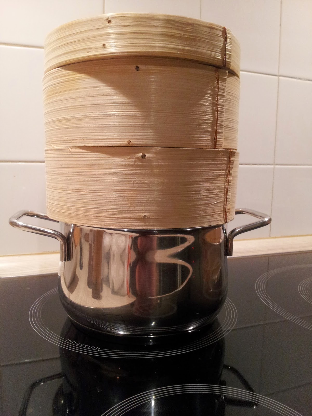 Ponemos un cazo con agua y sobre él, la vaporera de bambú. NOTA: Obviamente, valdrá cualquier otro método de vapor, el que tengáis por casa, pero lo suyo es tirar de herramientas originales. Que además se consiguen muy fácilmente y son bien baratas.