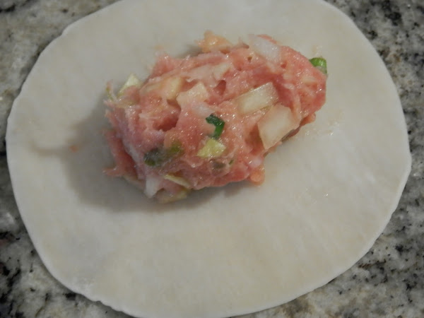 Ve cogiendo porciones para rellenar cada masa de gyoza.