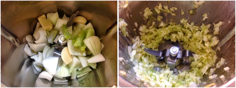 Pon en el vaso el aceite, la cebolla y los ajos y PROGRAMA 5 SEGUNDOS / VEL. 4. Con la espátula baja los restos de verduras del interior del vaso y de la tapa hacia las cuchillas. SOFRÍE 5 MINUTOS / VAROMA / VEL. 1.