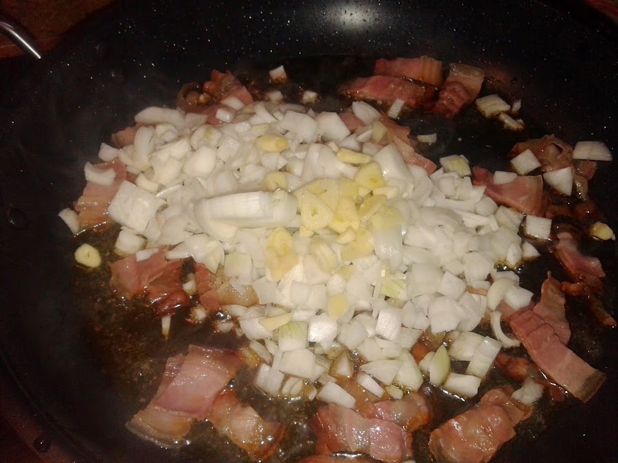 Sofreímos cuando está bien caliente el aceite y la manteca la panceta troceada.