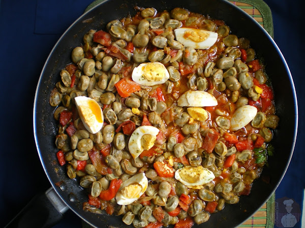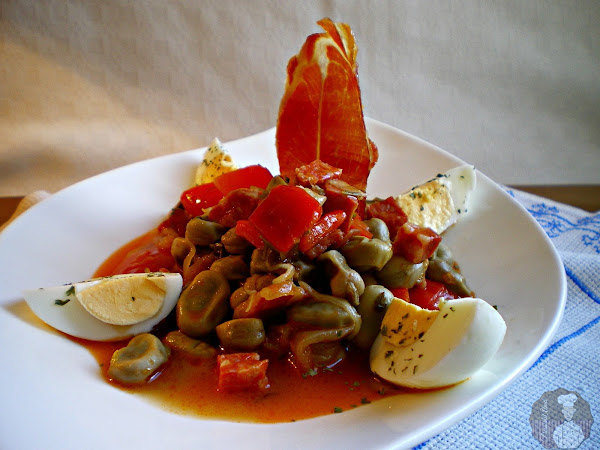 Para el emplatado, servir las habas y acompañar de huevo cocido troceado y las lonchas crujientes de jamón serrano a modo de peineta.