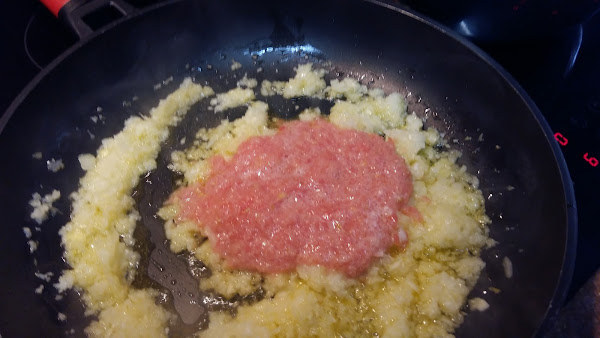 Trituramos la cebolla con los ajos y rallamos el tomate y lo añadimos a la paellera y sofreímos bien.