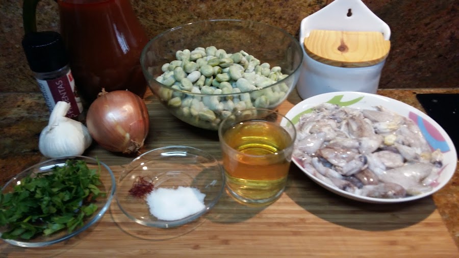 500 gr de habas congeladas, 500 gr de chipirones, 1 cebolla grande, 2 dientes de ajo, 1 tomate grande maduro, 1 vaso de vino blanco, 1L. de caldo de pescado, hebras de azafrán, sal, pimienta, 1 cucharadita de azúcar, aceite de oliva y perejil picado.